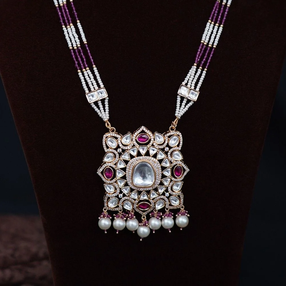 A beautiful traditional moti haar set with matching earrings. Designed with Kundan work, ruby accents, and pearl drops, this set is perfect for weddings, festivals, and special occasions. The triple-layer moti beads add elegance, making it a timeless piece of jewelry.