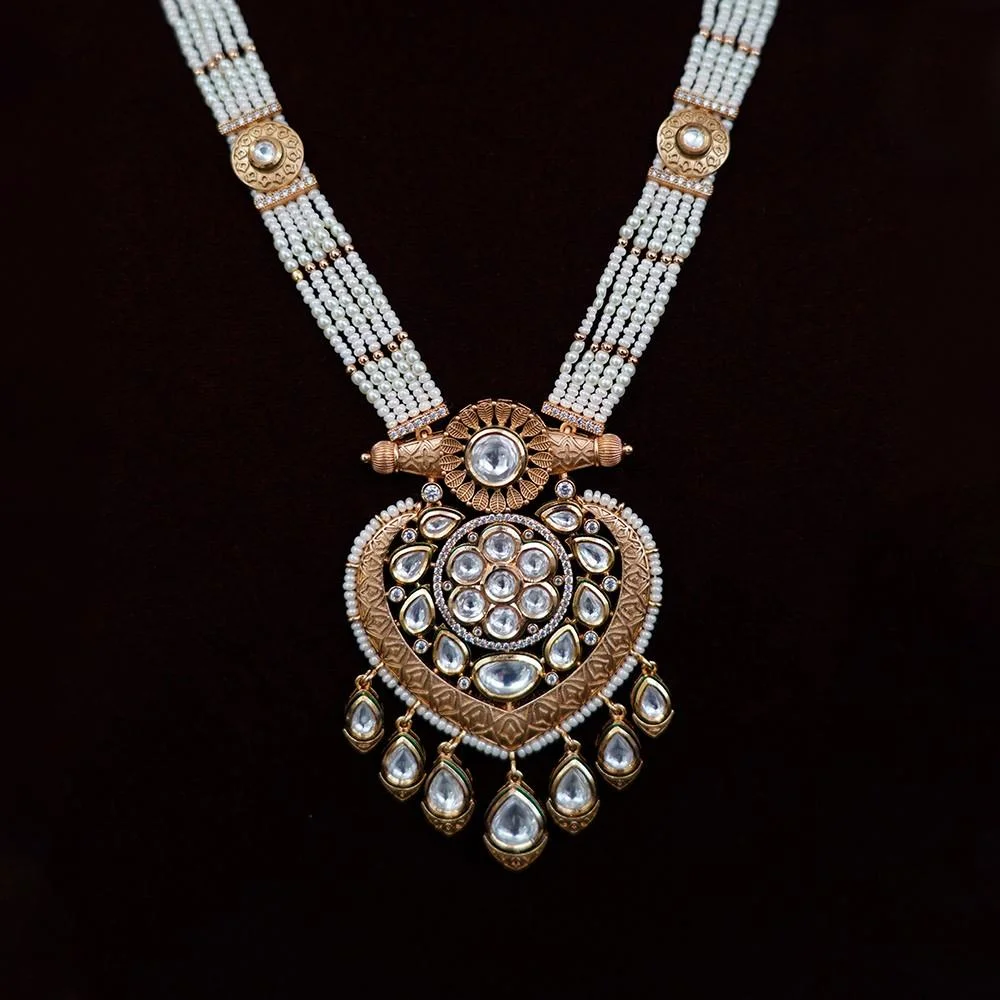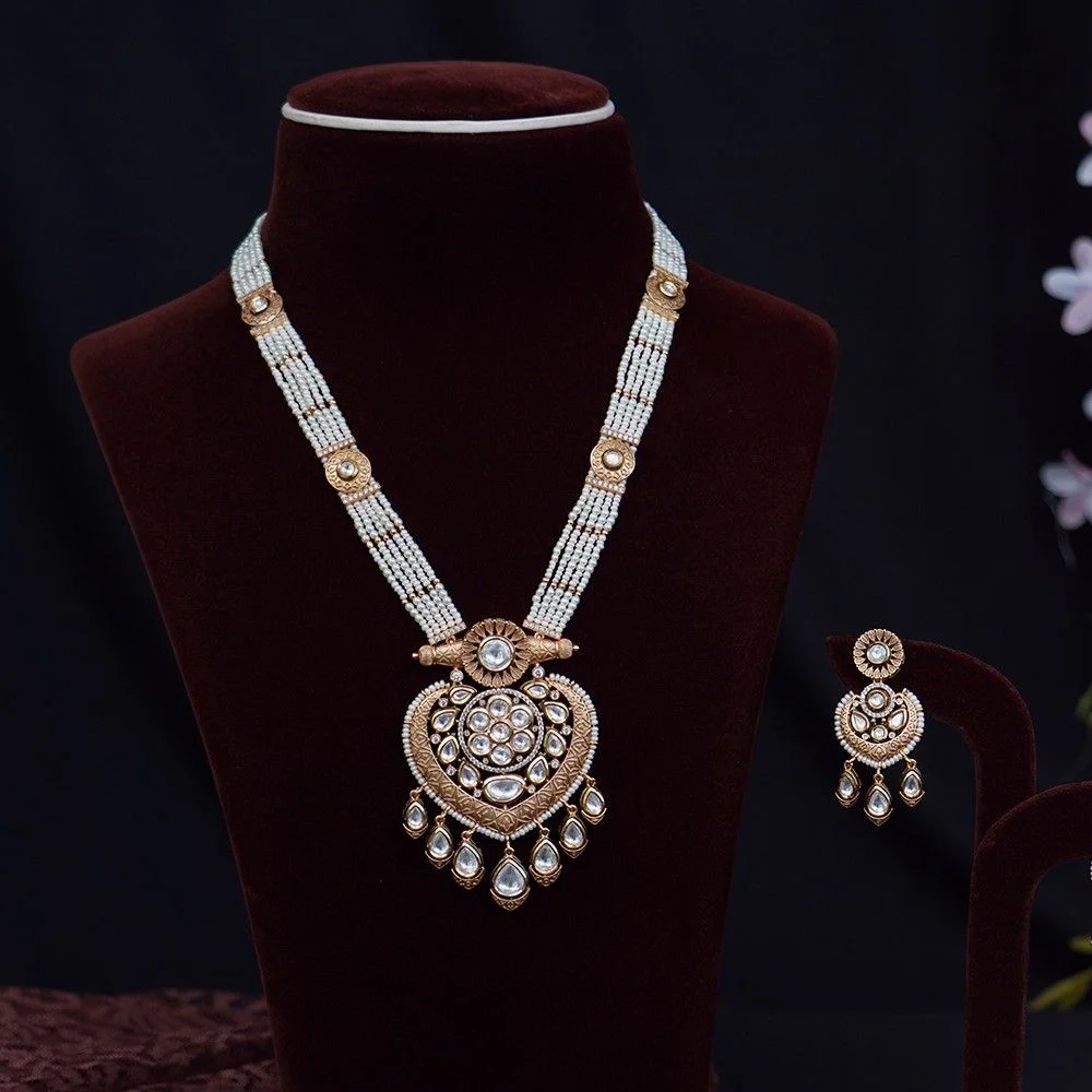 This striking jewelry set is a perfect example of classic Indian design. The necklace features multiple strands of delicate white pearls that lead to a large, heart-shaped pendant. The pendant is an intricate mix of antique gold-toned metalwork, sparkling white stones, and large, clear teardrop-shaped kundan stones. The set also includes matching earrings that echo the pendant design with a round stud top and dangling kundan stones, completing this beautiful and traditional look.