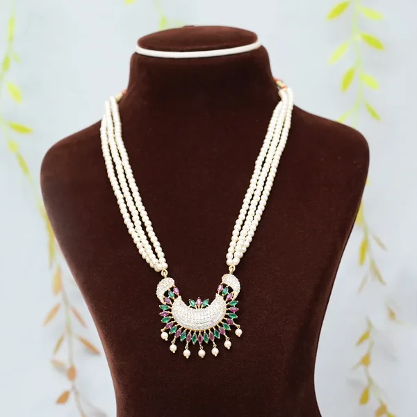 Discover the charm of this Elegant Moti Tanmani Necklace Set with Earrings, designed for budget-conscious shoppers and trendsetters. This stunning set features three strands of lustrous pearls (moti) paired with a crescent-shaped pendant adorned with vibrant green and red gemstones, accented by delicate white stones and pearl drops. The matching earrings echo the pendant’s design, adding a cohesive touch of sophistication. Perfect for weddings, parties, or festive occasions, this affordable jewellery set blends traditional craftsmanship with a trendy flair. Elevate your ethnic or modern outfits with this necklace set that offers elegance without the high price tag. Shop now to make a statement with this exquisite moti jewellery set!