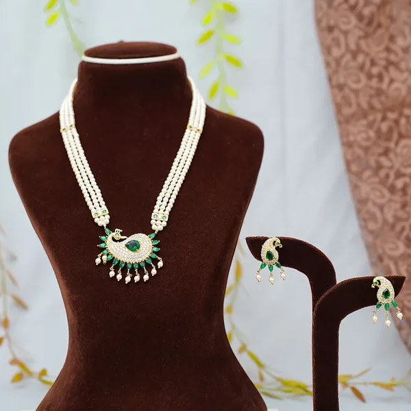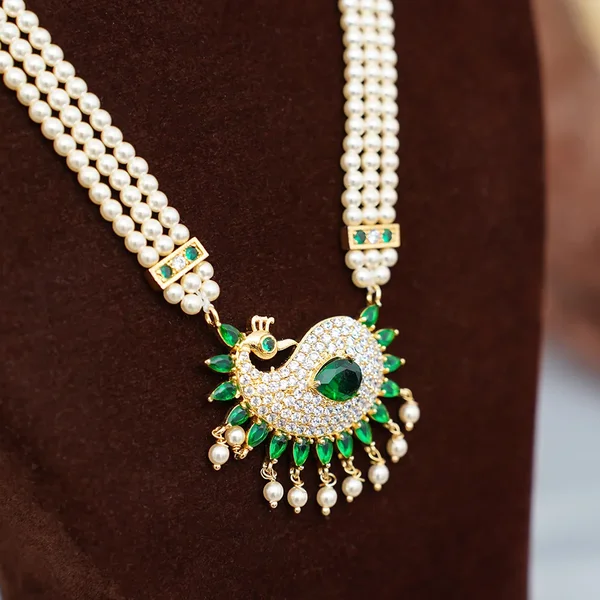Make a statement with this Moti Tanmani Necklace Set with Peacock Design, crafted for budget-conscious shoppers and trendsetters. This exquisite set features three strands of lustrous pearls (moti), adorned with a stunning peacock-design pendant showcasing vibrant green and white stones for a touch of elegance. The matching drop earrings, echoing the peacock motif, add a trendy flair to your ensemble. Perfect for weddings, festivals, or special occasions, this affordable jewellery set blends traditional artistry with modern style. Elevate your look with this elegant moti necklace set that offers sophistication at a budget-friendly price. Shop now to add this unique piece to your collection and shine effortlessly!