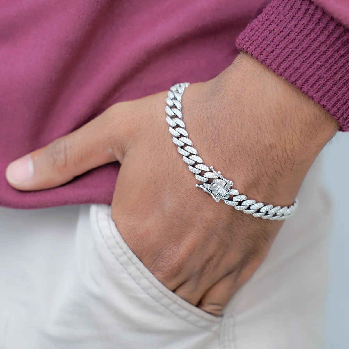 This striking piece is a luxurious, modern take on a classic street-style design, offering maximum shine. The bracelet features a bold link chain construction, characterized by its thick, interlocking, flattened oval links. The entire surface of the bracelet, including every link, is completely hundreds of tiny, brilliant round-cut cubic diamonds, giving the piece a dazzling, ""iced out"" finish.