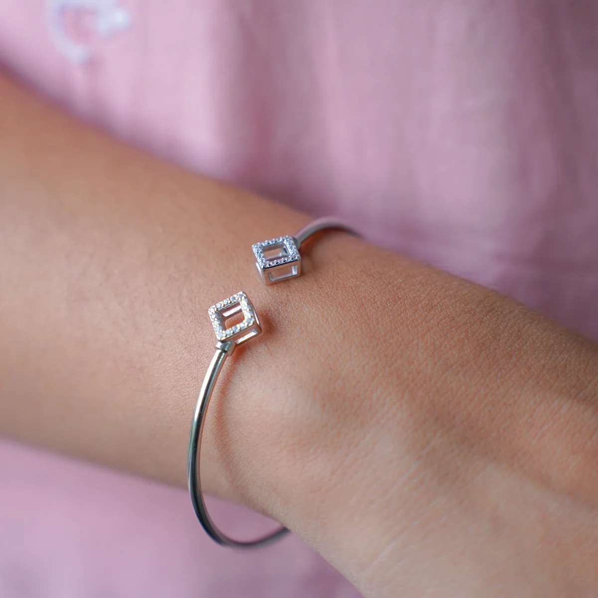The Orbit Diamond Bracelet combines clean lines with subtle brilliance for an effortlessly chic look. This slender, highly-polished metal cuff wraps elegantly around the wrist, featuring two open ends capped by perfect circles. Each circular finial is expertly set with a diamond accents. The minimalist design makes it perfect for everyday wear, either alone or as a sophisticated layering piece with other bracelets.
