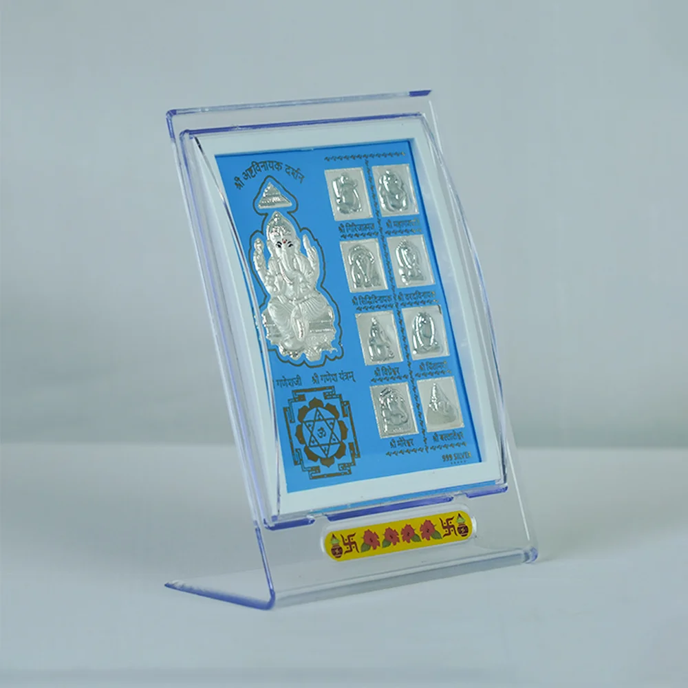 This is a religious frame that features the "Ashtavinayak," which are the eight (ashta) self-originated forms of Lord Ganesha (Vinayak). The centerpiece is a larger, silver-toned figure of Ganesha. Surrounding it are eight smaller, oval-shaped plaques, each representing one of the eight forms of the deity. The design also includes auspicious symbols like the swastika.