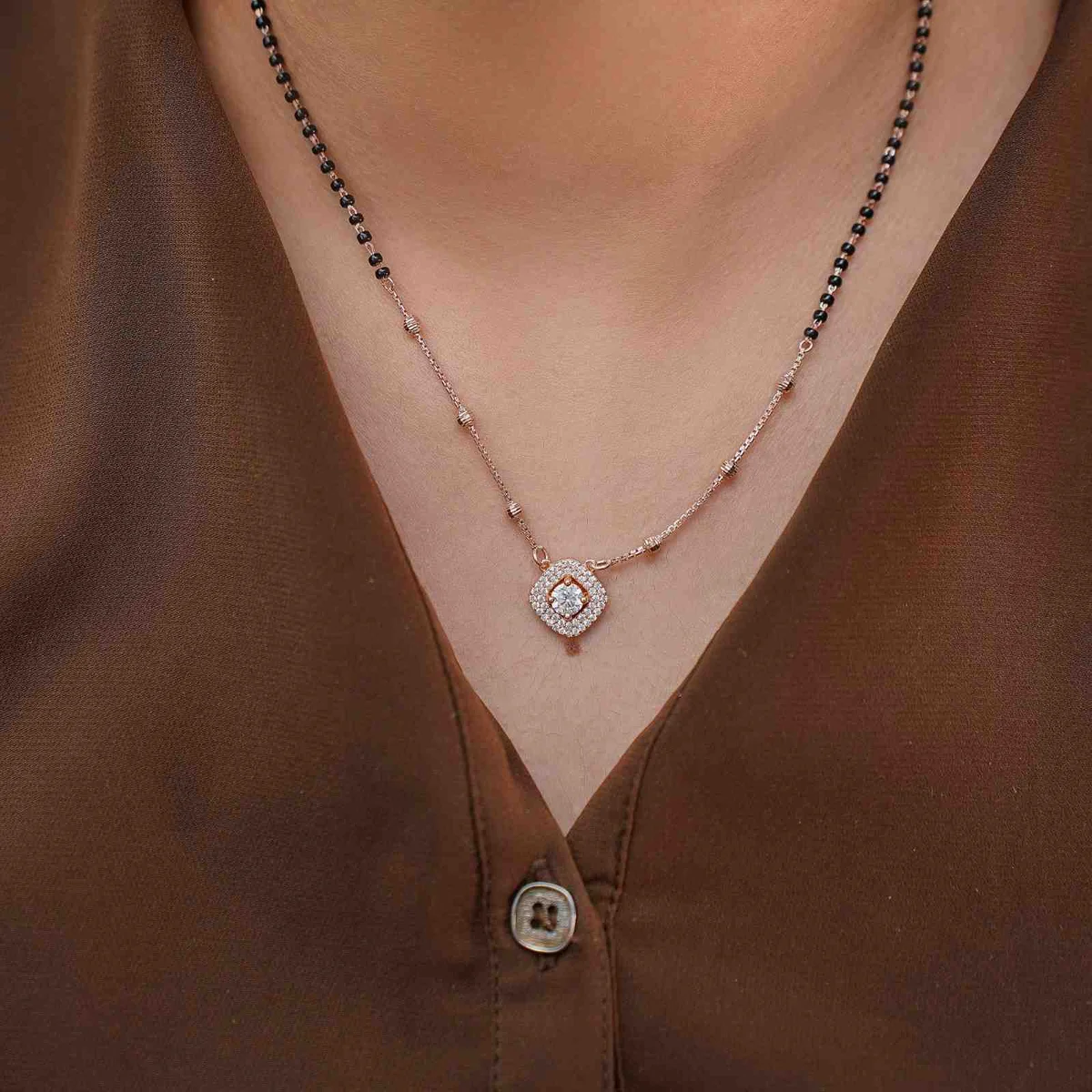 This Mangalsutra features an geometric pendant, offering a delicate and luxurious modern take on the traditional Indian mangalsutra. The piece is a fine rose gold-tone chain that is elegantly interspersed with the traditional small, glossy black beads along the top portion. The remaining chain is adorned with small, polished rose gold bead stations, adding texture and shine.