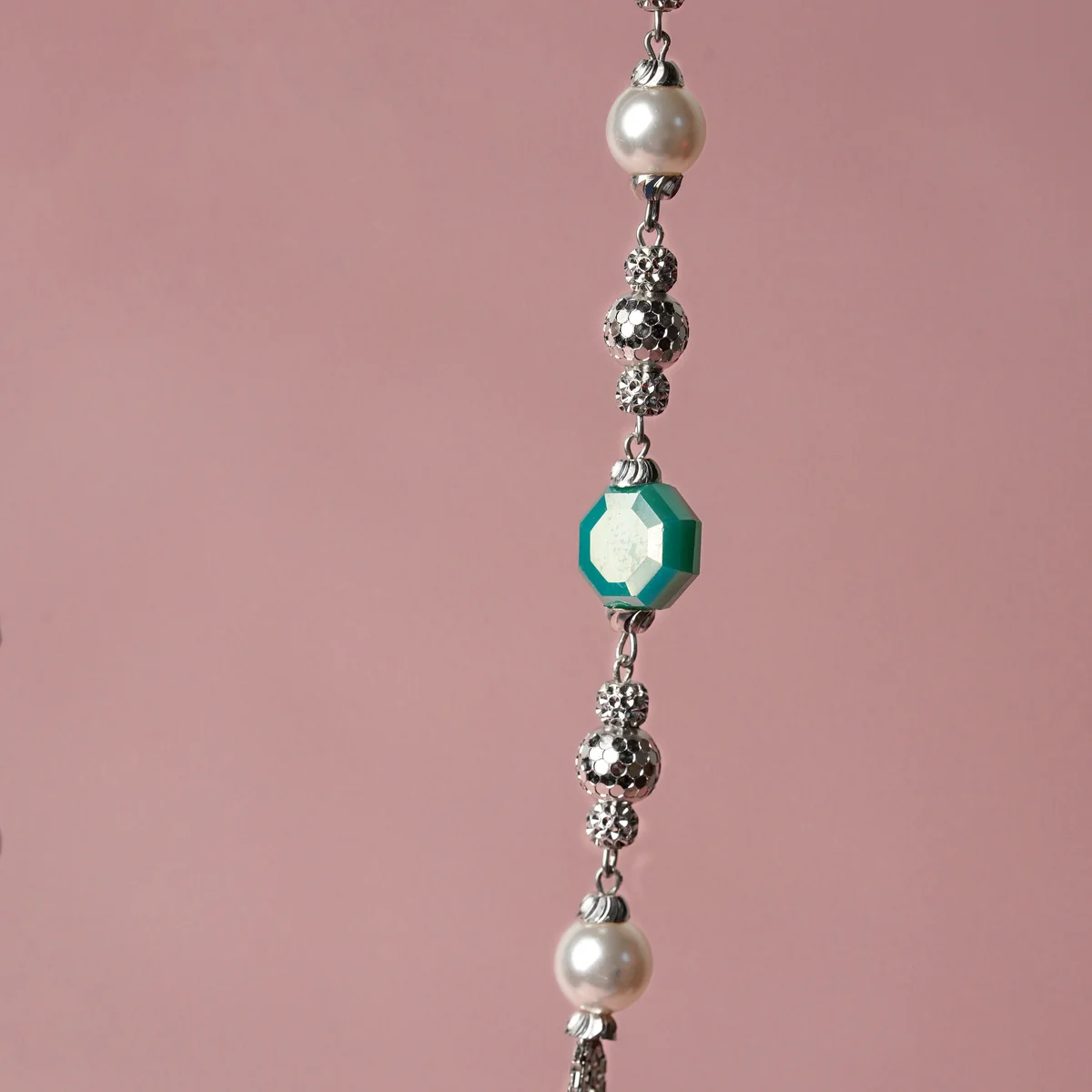 This is a beautiful, extra-long necklace that makes a statement! It has classic white pearls mixed with special bright green beads that look like polished gems. The silver chain is detailed with textured beads and multiple layers, making it look rich and expensive. Why you will love it: Makes any outfit fancy: Instantly dresses up a simple black top or dress. Big and noticeable: It is long and designed to stand out. Classic style: The pearls give it a timeless, elegant look. Wear it over a sweater, a simple blouse, or a fancy evening dress.