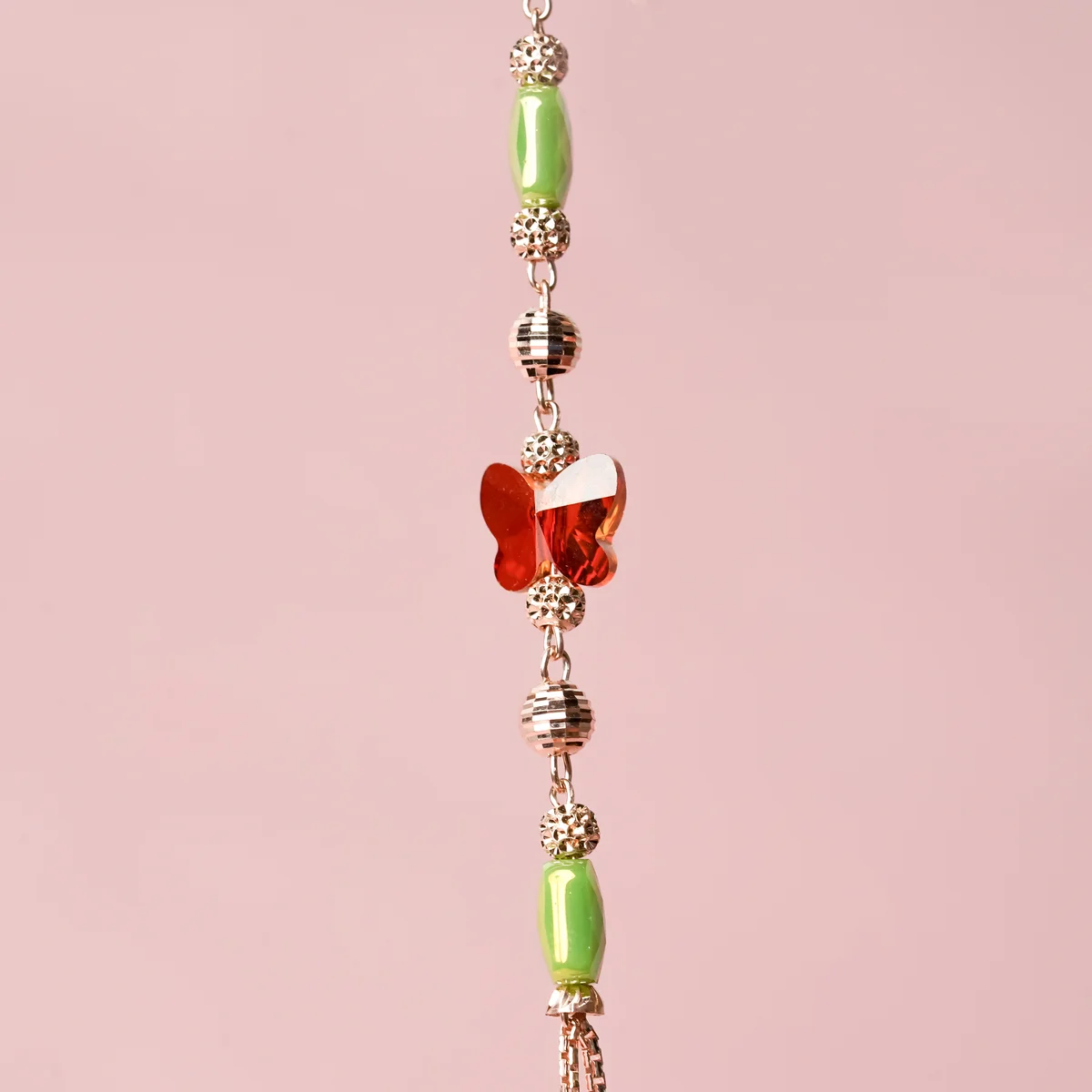 This is a long necklace that hangs down past the chest. It uses both metal chains and colorful beads. ​The necklace is made of a light-colored metal chain, which seems to have a few lines hanging together. The chain is decorated with tiny, spaced-out metal balls (sometimes called satellite beads). ​Along the top part of the chain, there are larger, colorful beads: ​Green beads: These are smooth and barrel-shaped. ​Orange/Red beads: These are cut into a fun, butterfly or fancy shape to catch the light. ​This necklace is perfect for wearing over sweaters, tops, or dresses to add a pop of color and a layered look.