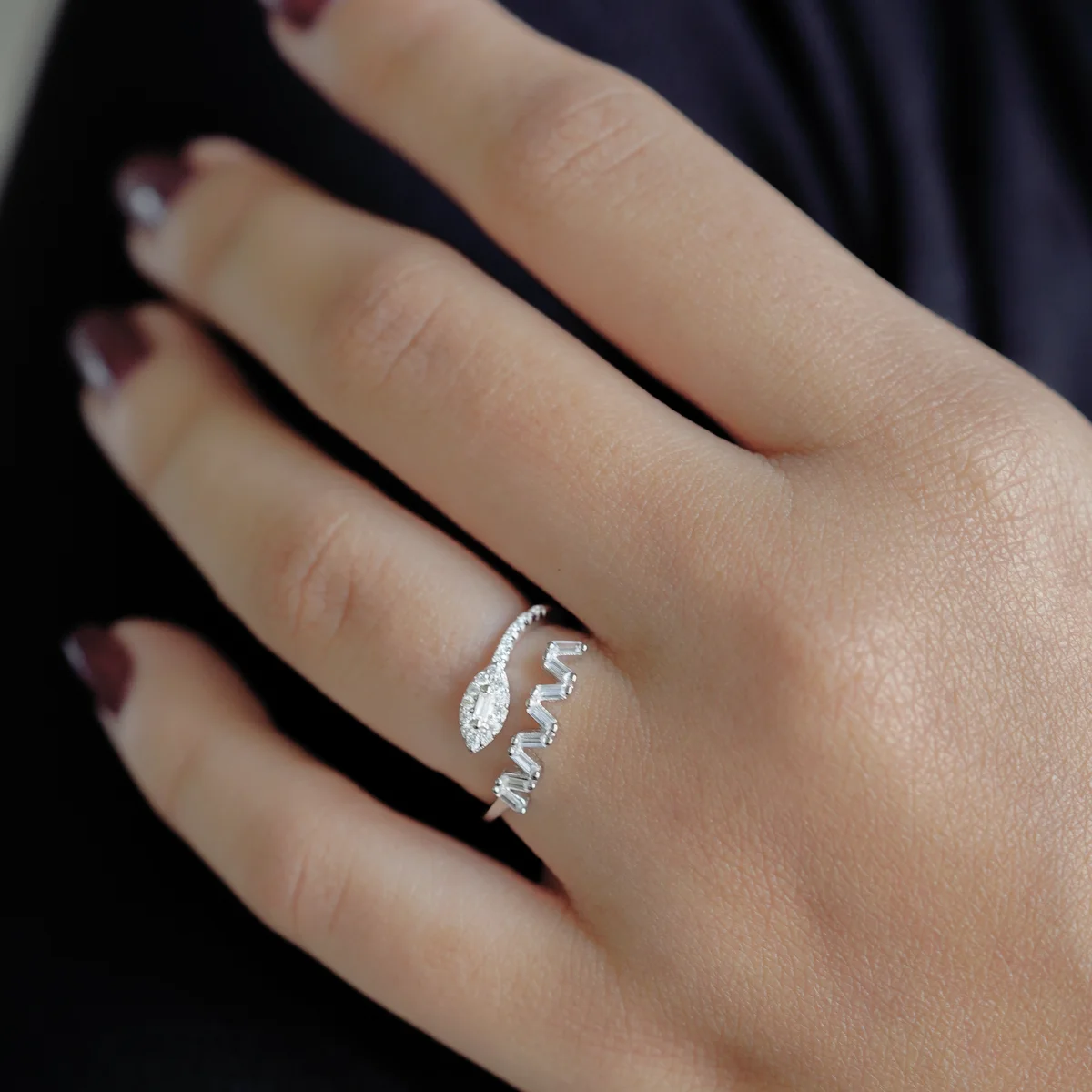 "This is a very unique, high-fashion ring with an open, adjustable design! It features a thin band made of shiny silver-colored metal. The ring is open in the front, with two different, sparkling ends. One end has a bright marquis-shaped stone. The other end has a line of three small, rectangular (baguette) stones. The mix of stone shapes is very modern. Why you will love it: Unique design: The open style is modern and can be adjusted slightly. Fashionable stones: The baguette-cut stones are very trendy right now. Eye-catching: The asymmetrical (uneven) design draws attention. This is the perfect piece if you love unique, stylish, and high-fashion jewelry!"