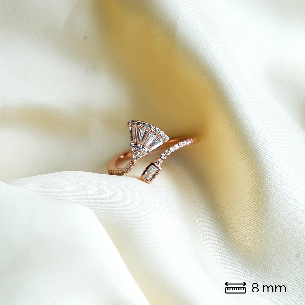 This sophisticated ring is set in warm rose gold-tone metal. The top features a prominent, fan-shaped cluster of brilliant-cut stones, composed mainly of gems. The band elegantly wraps around, finishing with a smaller, rectangular baguette accent on the lower curve.