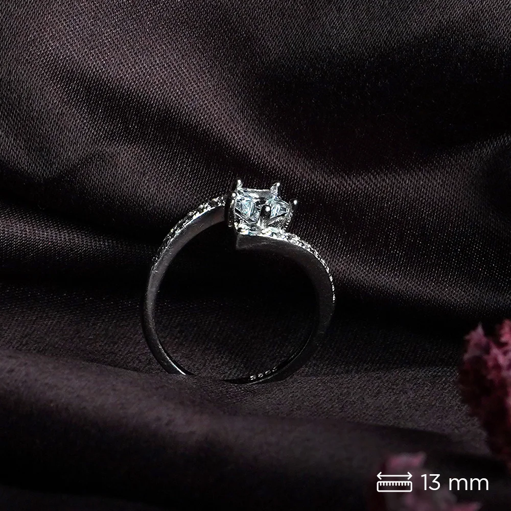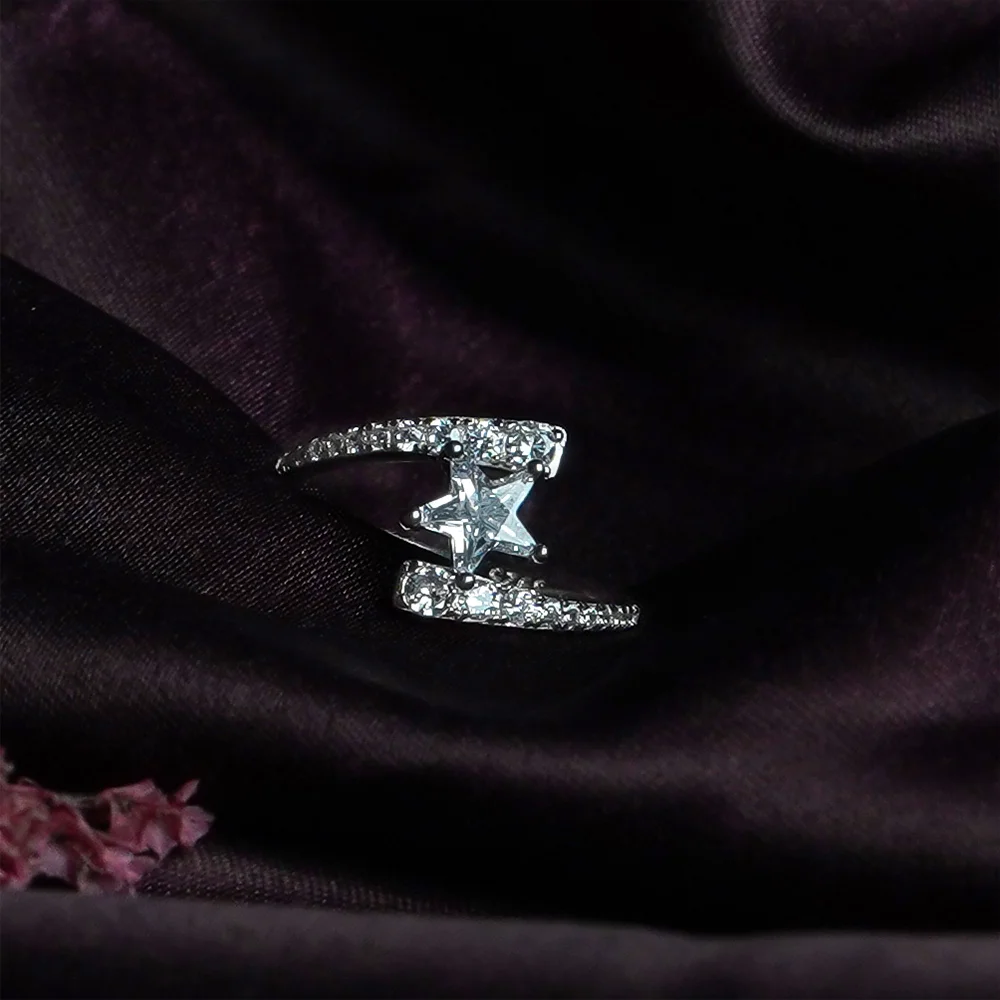 A unique ring where the band crosses over (bypasses) itself. The center features a prominent star-cut stone, and the bands are lined with small stones for extra sparkle.