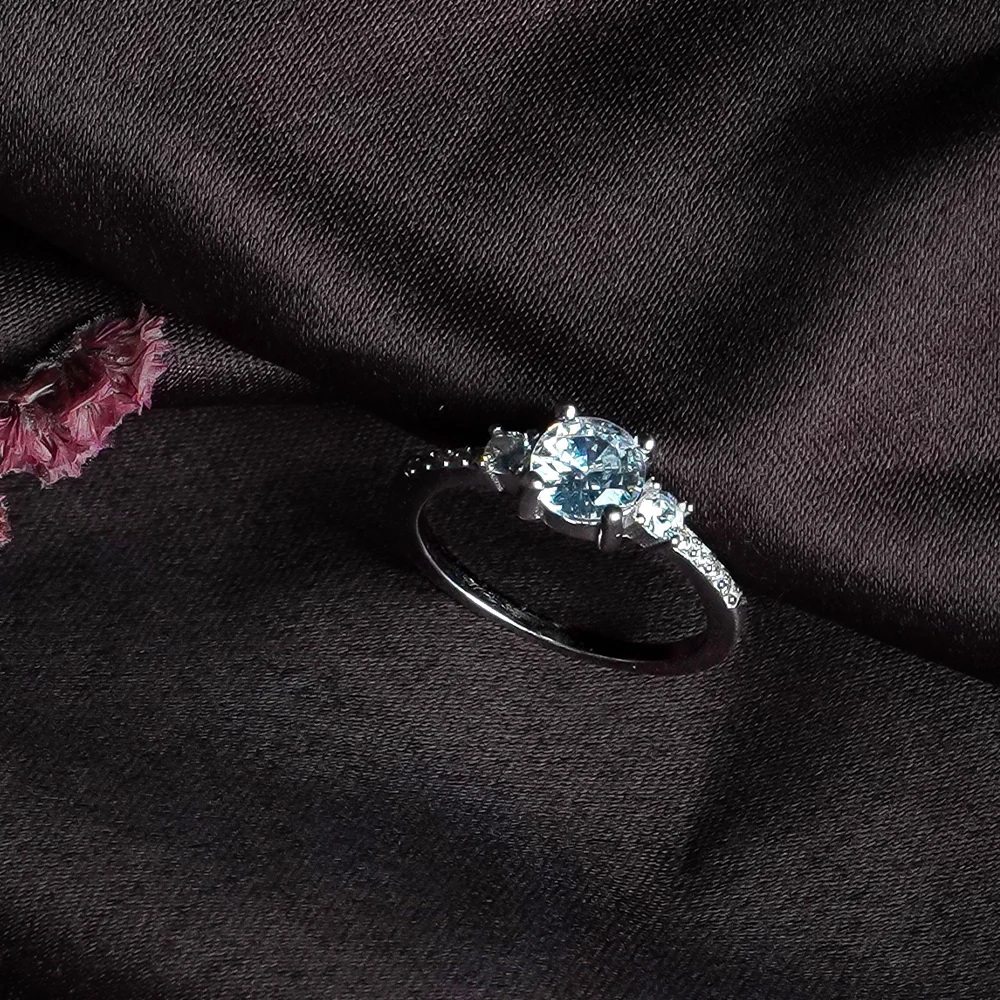 A delicate ring featuring a central light blue or clear round stone flanked by two smaller stones. The band is lined with tiny stones for extra sparkle.