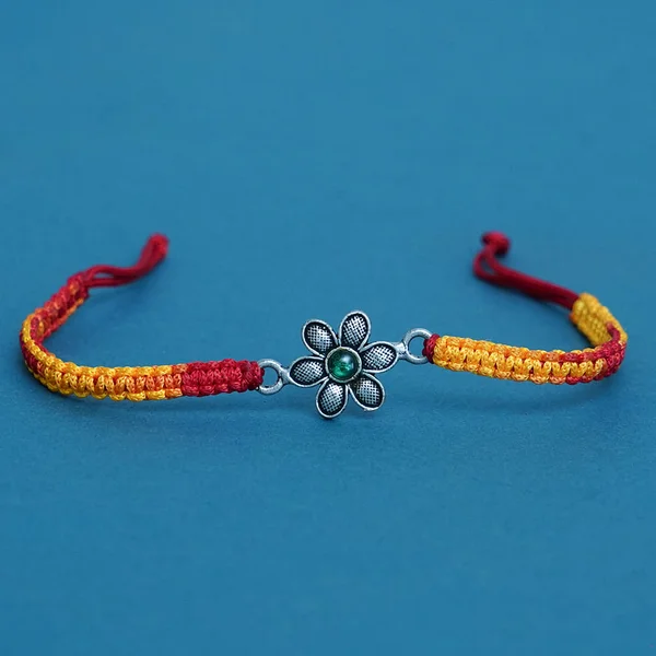 Add a fresh and graceful touch to Raksha Bandhan with this Floral Design Oxidized 925 Silver Rakhi. Featuring a detailed oxidized silver flower centerpiece with a striking green stone at the center, this rakhi balances tradition with vibrant charm. The hand-braided red and yellow thread adds festive warmth, making it ideal for brothers who love something different yet rooted in tradition. Made for budget-conscious shoppers, this rakhi doesn’t compromise on quality — crafted with genuine 925 sterling silver, it’s lightweight, skin-friendly, and made to last beyond the occasion.