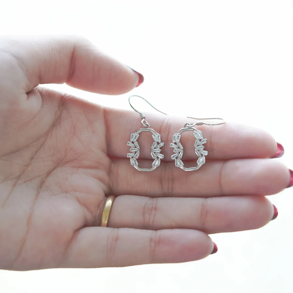 "These are very modern and artistic drop earrings that have a high-fashion look! They feature a silver-colored metal open geometric shape (like a rectangle with soft corners) that hangs from a simple fish-hook wire. The center of the shape is filled with small, rectangular (baguette) stones placed in a modern, scattered pattern. Why you will love them: Unique and trendy: The modern shape and baguette stones are very stylish. Lightweight: The open design makes them comfortable for all-day wear. Great movement: The drop style swings gently and catches the light. These earrings are perfect for adding a chic, modern touch to any outfit!"