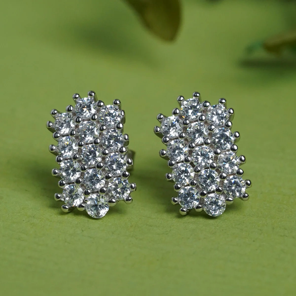 These are beautiful round stud earrings with an intricate floral design. The center features a sparkling round stone surrounded by a ring of smaller stones. The top part flares out with pointed petals, giving the look of a lotus flower or a bursting star.