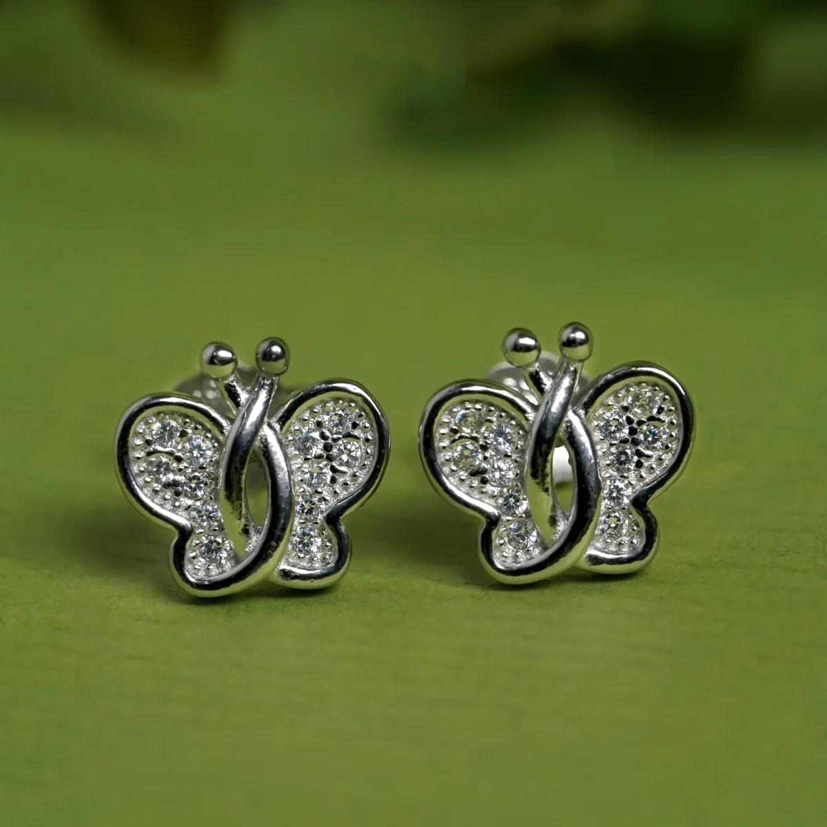 These are very cute and charming butterfly stud earrings! They are made from bright silver-colored metal. The wings have a shiny outline, and the back wings are filled with small, bright stones to give a lovely sparkle. They are the perfect size for wearing every single day. Why you will love them: Super cute design: The butterfly shape is fun and happy. Simple daily sparkle: They add a little bit of shine without being too heavy. Great gift idea: Perfect for friends or family who love nature and light jewelry. These earrings will add a touch of joy to any look!