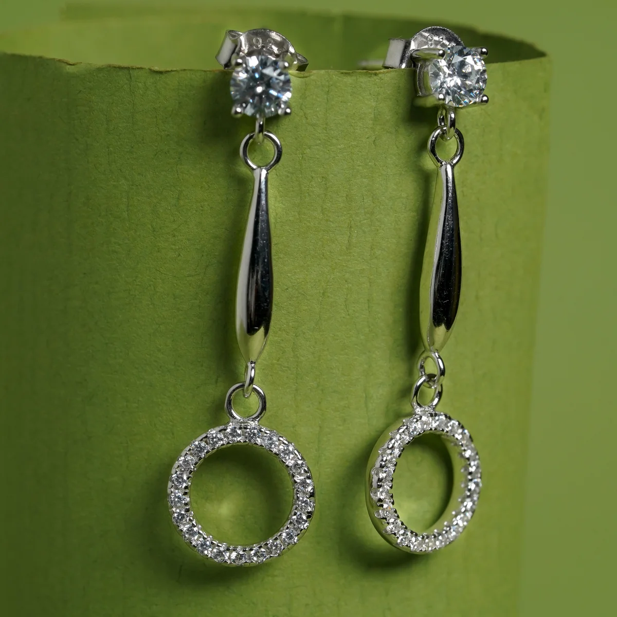 These are elegant, medium-sized drop earrings that are perfect for any occasion! They feature a small, bright stone at the top stud. A polished silver bar hangs from the stud, leading to a sparkling open circle (a ""halo""). The circle is completely lined with many small, bright stones. Why you will love them: Great movement: The drop style swings gently and catches the light. Classic and versatile: Simple circles and stones always look fashionable. Dress up or down: Perfect for work, parties, or date nights. These are a timeless pair of earrings that you will wear again and again!