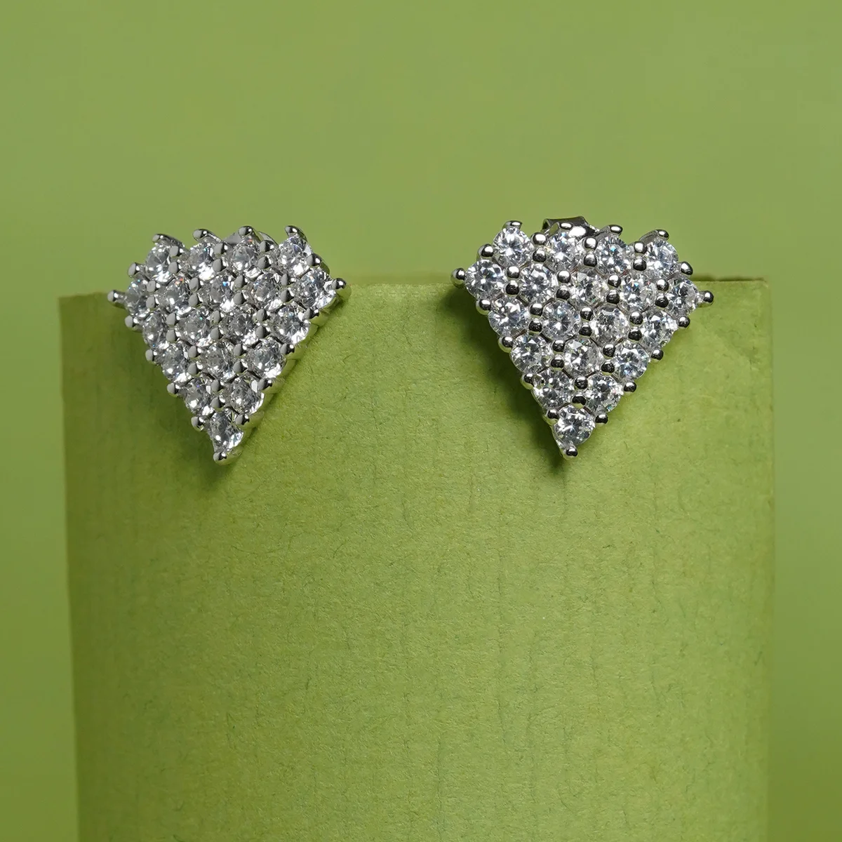 These are bright stud earrings shaped like a triangle (or the top half of a heart). They are completely covered in many tiny, clear, sparkling stones set closely together. The silvery metal is not visible, making the whole earring look like a solid cluster of diamonds. They are a bold and simple way to add a lot of sparkle to your look.