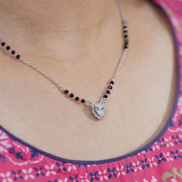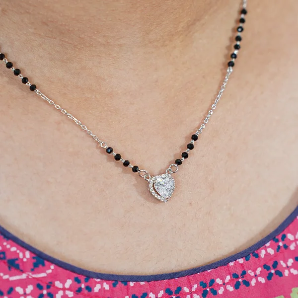 This piece offers a subtle and refined take on the traditional mangalsutra. It showcases a small, simple heart pendant made of polished, silver-plated metal, with a single, clear stone set in the center. The pendant hangs from a slender chain accented with a row of black beads. Its delicate and understated design makes it ideal for everyday wear, adding a touch of grace to any outfit.