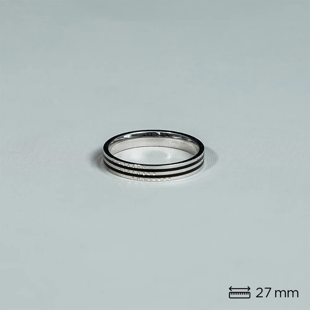 A sleek, modern ring with a simple, highly polished silver-tone finish. The design is accented with two thin black or dark-tone enamel pinstripes running horizontally around the band's center, offering a refined, minimalist look. The band width is substantial, measured at 27 mm.