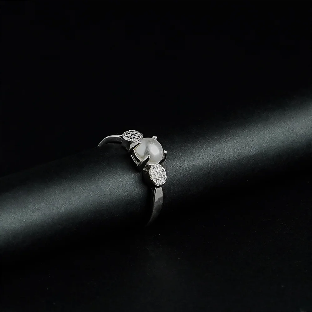 This delicate and feminine ring is set in silver-tone metal. The top features a charming cluster of three gems. The central stone is a smooth, luminous white pearl or opalescent bead. This pearl is flanked by two brilliant, round cluster settings that are fully paved with tiny accent stones, creating a beautiful contrast between the smooth, classic pearl and the sparkling diamonds.