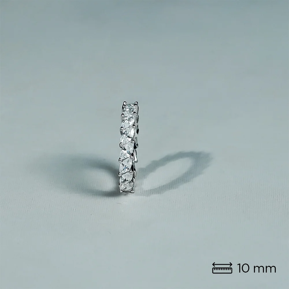 A brilliant eternity band featuring a continuous line of clear marquise-cut stones set vertically in highly polished silver-tone metal. The stones are prong-set closely to maximize light return. This is the silver-tone complement to your Rose Gold Marquise Band, perfect for stacking or wearing alone. The width is measured at 10 mm.