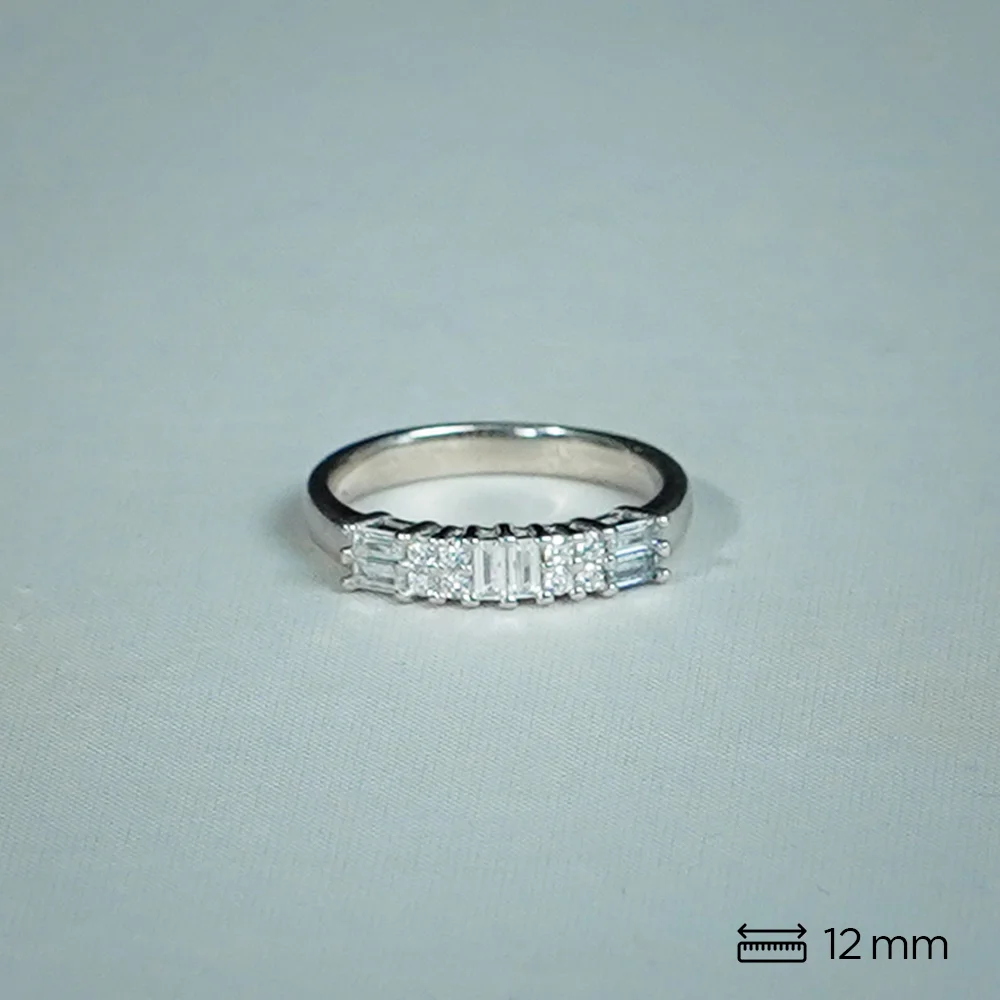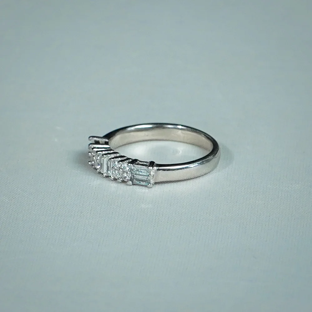Add timeless elegance with this Sterling Silver Baguette Eternity Ring. The band features five horizontally set baguette-cut stones, offering a sleek geometric sparkle. Its half eternity design is versatile, making it perfect as a wedding band, stackable ring, or minimalist everyday accessory. Crafted for comfort, this ring brings modern luxury to any look.